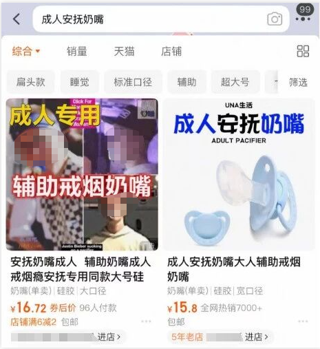 记者在电商平台搜索“成人安抚奶嘴”,结果显示,大部分“成人安抚奶嘴”价格在10元—20元,部分价格达到500元/个,有店铺销量超过7000件。
