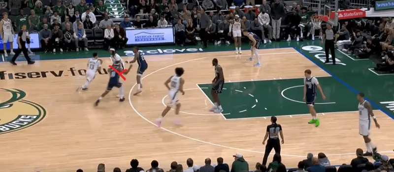 接球突破时注意到加福德和特伦特的这组错防,利用加福德刷卡位距离特伦特站位过远,罗林斯突破一步横传队友把握半空位出手机会: