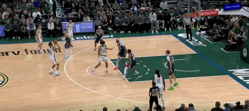 这一次的弧顶drag掩护发起,雄鹿在有球端和无球端的挡拆同时启动,目的是让库兹马顺下接球有更好的攻筐空间,左侧特伦特借西姆斯的exit掩护兜出,库兹马顺下接罗林斯口袋传球切入快速得分: