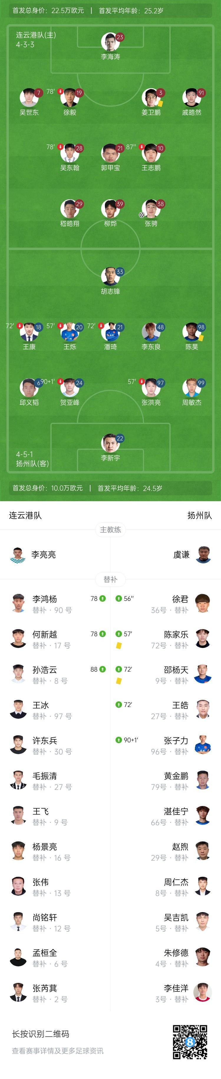 直播吧8月31日讯 北京时间8月31日19:35,江苏联第10轮,连云港队主场迎战扬州队。上半场,张骋破门打破场上僵局!半场战罢,连云港队暂1-0扬州队;下半场,嵇皓翔屡失良机,双方再未能取得进球。全场比赛结束,连云港队1-0扬州队!