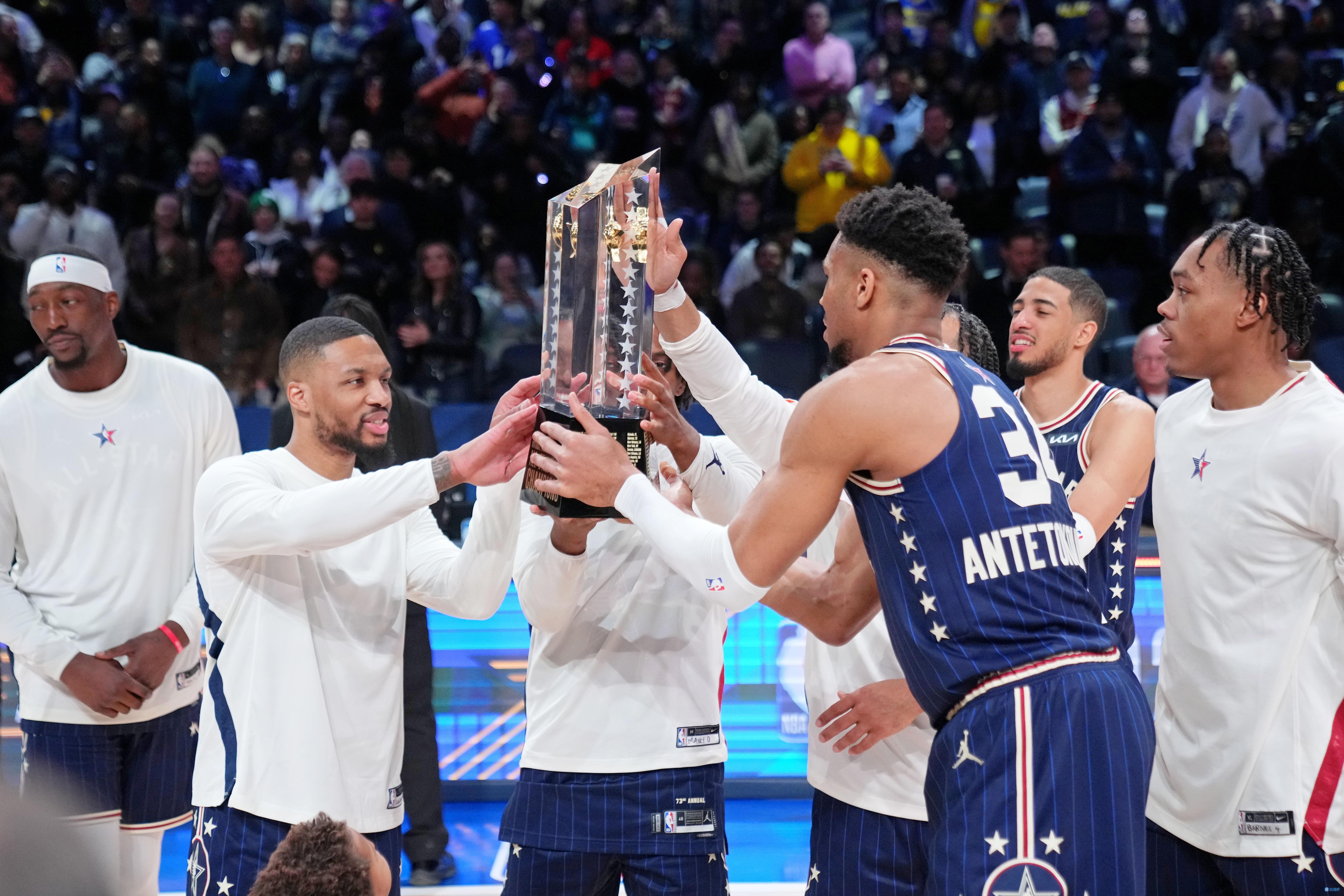 字母哥队:塔图姆、莫兰特、米切尔、马尔卡宁、利拉德、霍勒迪、亚历山大、德罗赞、西亚卡姆、阿德巴约、小萨博尼斯