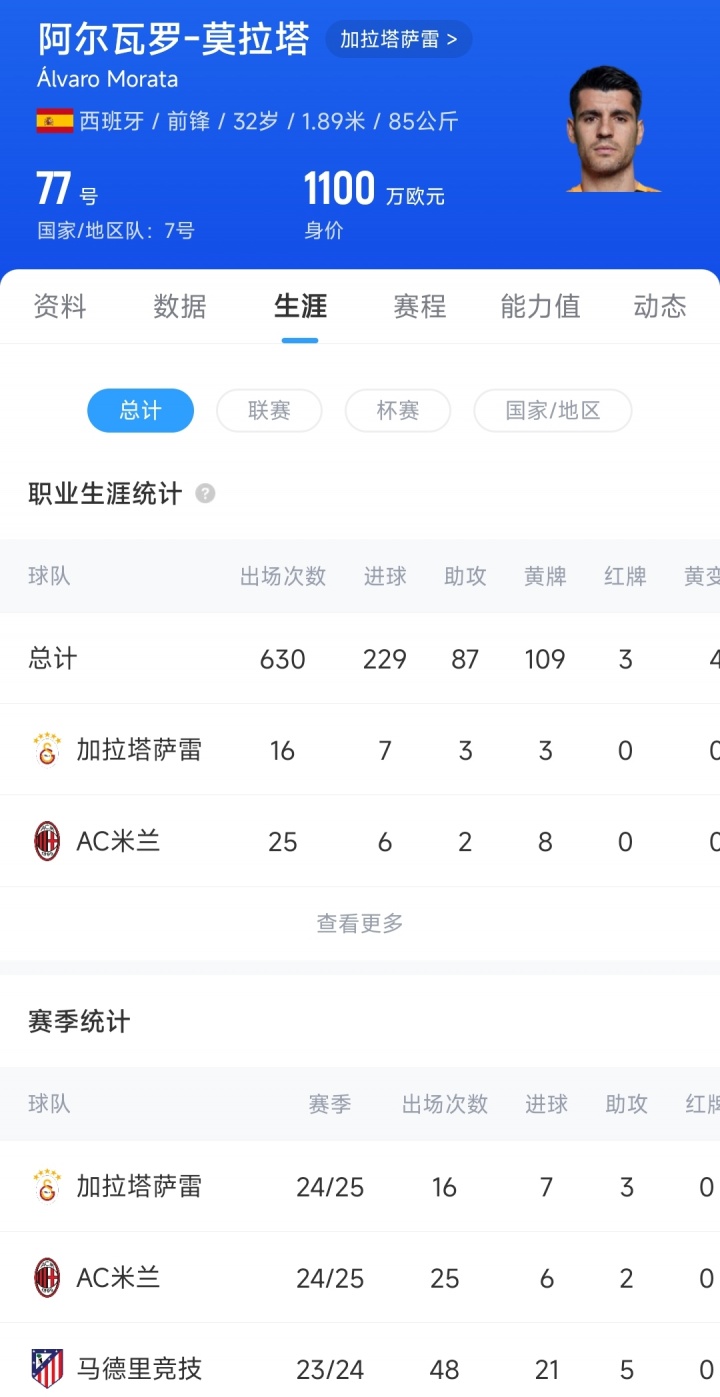 现年32岁的莫拉塔上赛季租借效力加拉塔萨雷期间,16场比赛贡献7球3助攻。根据德国转会市场最新数据,其身价估值达1100万欧元。
